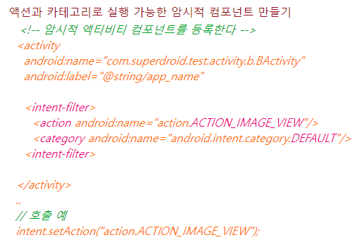 아래의 형식으로도 사용할 수 있다. AndroidManifest.xml 파일 내용에 해당 액티비티의 intent-filter를 적용하여 실제 호출하는 액티비티에 intent.setAction()으로 호출하면 된다.